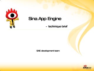 Sina App Engine provides a technical briefing on their development team, techniques, architecture, and improvements to their platform. Their team is small but effective and works cooperatively and independently. Their technique is built upon existing open source projects like Zend, Apache, and uses multiple languages and platforms. They are concerned with scalability, security, availability, and simplicity.