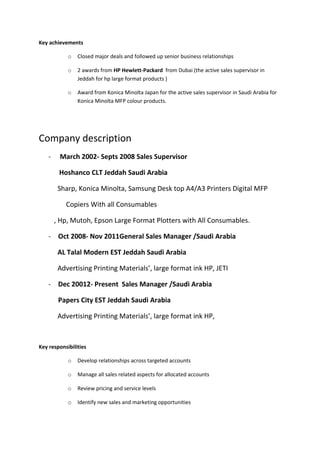 Sa'ed Tweir is a Jordanian national with over 7 years of experience in sales management. He has a proven track record of developing new business, exceeding sales targets, and motivating sales teams. He is skilled in Microsoft Office, customer service, business development, and importing products from Europe, China, and Taiwan. Currently he is a Sales Manager at Papers City EST in Jeddah, Saudi Arabia where he develops relationships with key accounts and manages all sales aspects. Previously he held sales supervisor and general manager roles at various companies specializing in printing materials and office equipment.