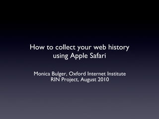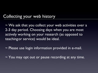 The document provides instructions for collecting a user's web browsing history using the Apple Safari browser over a 2-3 day period. It outlines 10 steps to configure Safari preferences and proxy server settings to record browsing data without collecting personal information. Users are told they can pause or disable the proxy at any time and that the process should not significantly slow down web access.