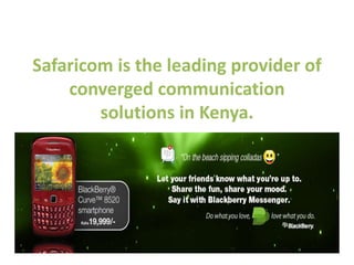 Safaricom is the leading provider of converged communication solutions in Kenya. In addition to providing a broad range of first-class products and services for Telephony, EDGE, Broadband Internet and Fax, Safaricom seeks to uplift the welfare of Kenyans in direct ways through value added services and financial support for community projects.