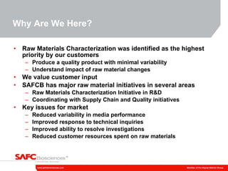 1) SAFC Biosciences is launching a Raw Material Characterization Initiative to reduce variability in media performance and improve response to technical issues by better understanding the impact of raw material changes.