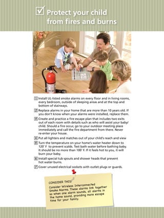 This child safety guide provides new parents with a comprehensive checklist to protect their child from various hazards, including fire, choking, suffocation, falls, poisons, and water-related dangers. Key recommendations include installing smoke and carbon monoxide alarms, using safety gates, and ensuring that poisonous substances are securely stored. The guide emphasizes the importance of supervision and preventative measures to create a safe home environment for children.