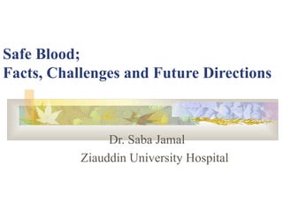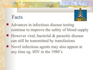 International standards for screening blood donations require testing for hepatitis B, hepatitis C, HIV, syphilis, and malaria. While screening has improved blood safety, risks remain as new infectious agents may emerge and current tests have window periods where early infections are not detected. In Pakistan, screening is not uniform across centers and some use substandard methods, like pooling donor samples, which increases transmission risk. Future directions include fully implementing standard screening tests, minimizing residual risks through new tests, encouraging healthy volunteer donors, and increasing awareness of transfusion risks.