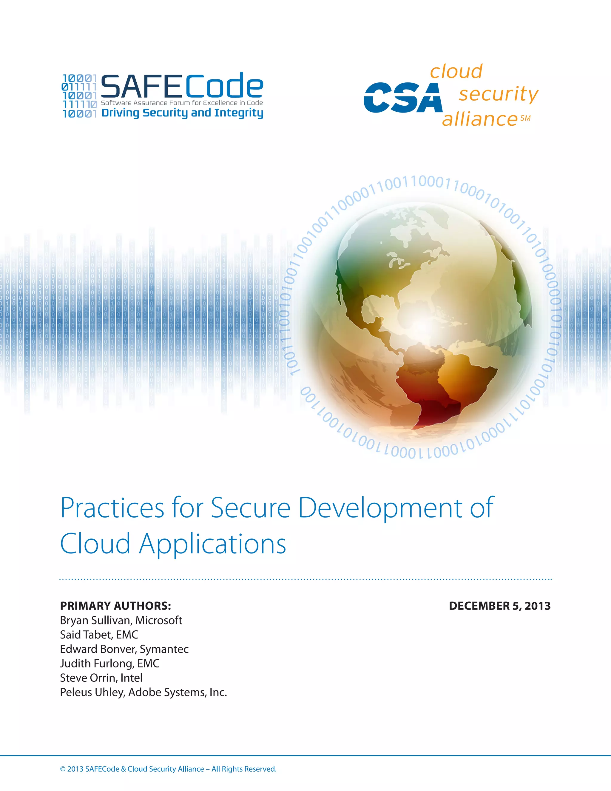 This document provides a summary of practices for secure development of cloud applications. It was created by a working group from the Software Assurance Forum for Excellence in Code (SAFECode) and Cloud Security Alliance (CSA) to identify additional security practices needed to address unique threats to cloud computing. The document analyzes security considerations for the Platform as a Service (PaaS) cloud computing model and provides recommendations in 6 areas: multitenancy, trusted compute pools, tokenization of sensitive data, data encryption and key management, authentication and identity management, and securing APIs.