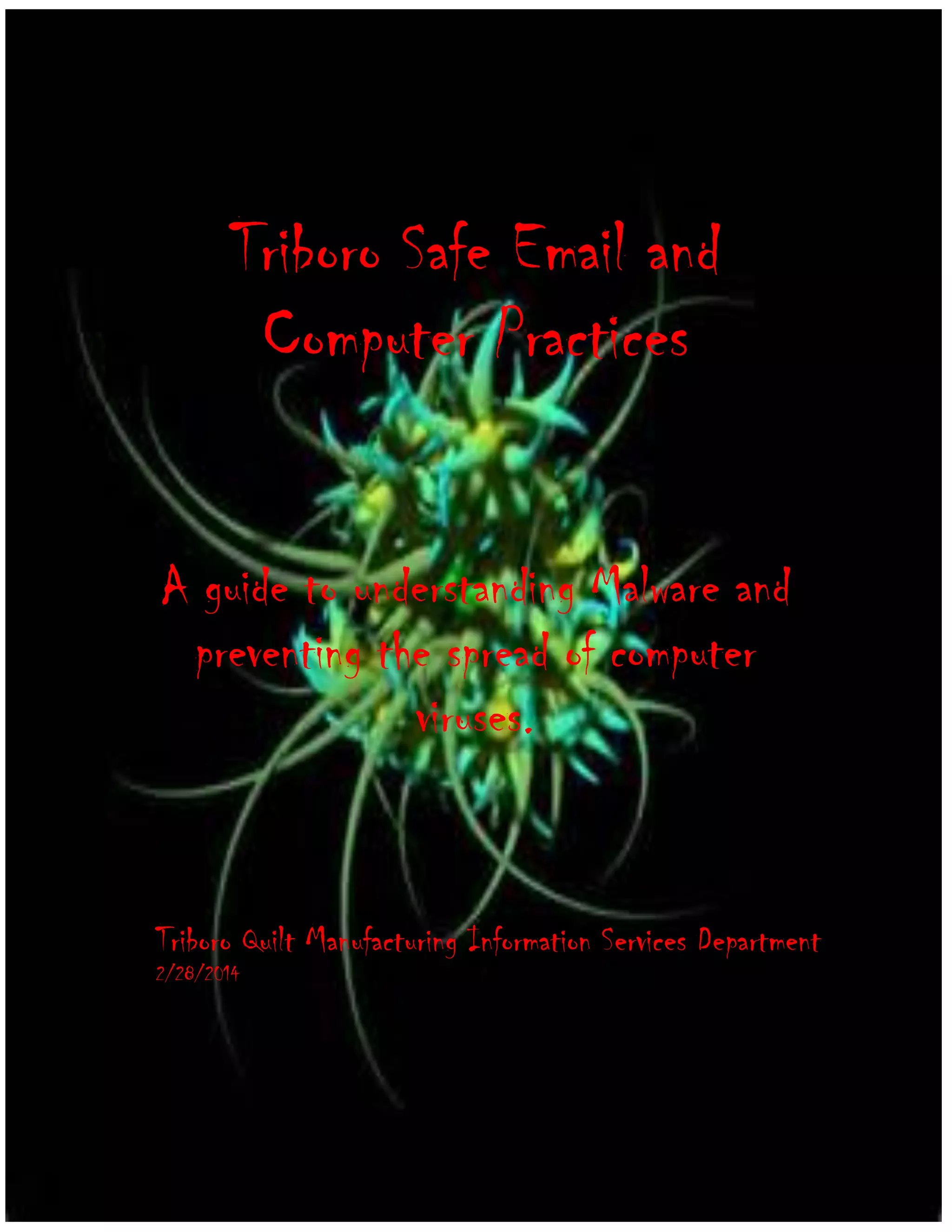 This document provides guidance on identifying and preventing the spread of malware through emails. It discusses how malicious emails try to trick recipients through spoofing, phishing links and attachments. Examples are given of common types of malicious emails, like those disguised as package tracking notifications but containing viruses. The document advises users to be wary of emails from unknown senders or containing strange formatting, links or large attachments meant to infect computers. Proper precautions can help safeguard systems from data loss or theft resulting from malware spread through emails.