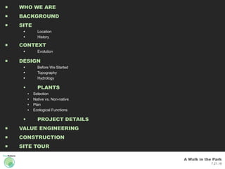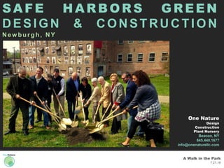 One Nature designed and constructed a new park located in Newburgh, NY. The park was previously a sterile asphalt lot with poor drainage. One Nature redesigned the topography and hydrology to add vegetation and address stormwater issues. Native plants were selected to provide habitat and seasonal interest. Construction included installing boulders, walls, drainage, paths and planting. The new park will offer community space for events and activities.