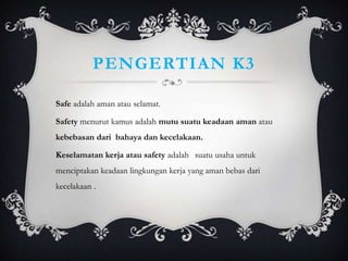 Dokumen tersebut membahas tentang pengertian K3 (Keselamatan dan Kesehatan Kerja) yang dirumuskan oleh ILO/WHO sebagai upaya mempromosikan dan memelihara kesehatan fisik, mental, dan sosial pekerja serta mencegah risiko kecelakaan kerja. Dokumen tersebut juga menjelaskan tujuan, sejarah perkembangan, dan syarat-syarat K3 serta contoh pakaian dan alat pelindung yang digunakan untuk m