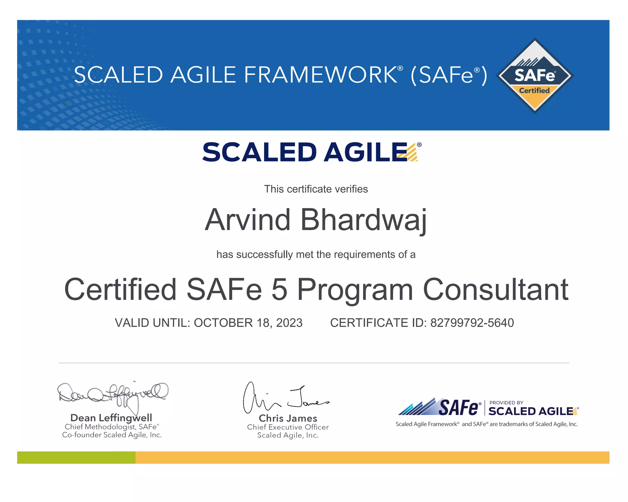 Arvind Bhardwaj has received certification as a SAFe 5 Program Consultant, having met the requirements for this role. His certification is valid until October 18, 2023 and is verified by the certificate identification number 82799792-5640.