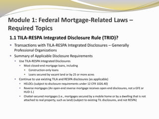 1) The TILA-RESPA Integrated Disclosure Rule (TRID) and the types of loans that use integrated versus existing disclosures.