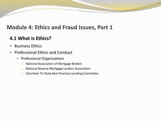 This document covers ethics and fraud issues in the mortgage industry. It discusses the definition of ethics, characteristics of predatory lending and victims of predatory lending practices. Predatory practices discussed include kickbacks, excessive fees, unfair penalties, loan flipping, equity stripping and various mortgage scam. The document also outlines the Consumer Financial Protection Bureau's role in enforcing consumer protection laws through complaint processes, administrative adjudication, civil penalties, redress and enforcement actions against practices like false advertising, redlining, foreclosure deceit and steering.