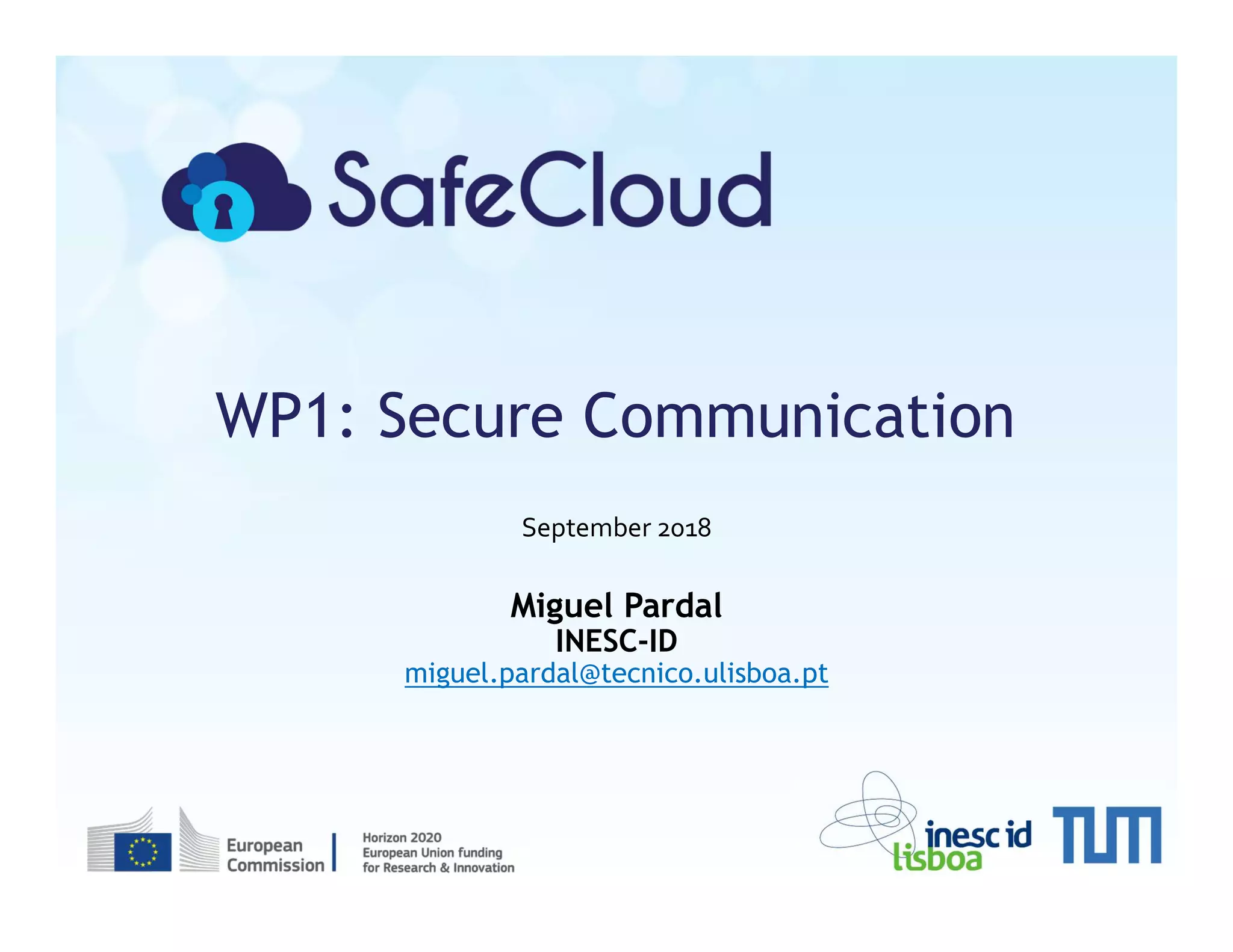 The document outlines the objectives and solutions for enhancing secure communication within the SafeCloud platform, focusing on middleware services that protect data privacy and security during cloud communications. It describes various secure communication solutions, including vulnerability-tolerant channels, protected channels, and route-aware channels, while emphasizing the importance of robustness against advanced adversaries. The achievements and scientific contributions of the SafeCloud project are also summarized, highlighting completed tasks, deliverables, and evaluations of implemented solutions.