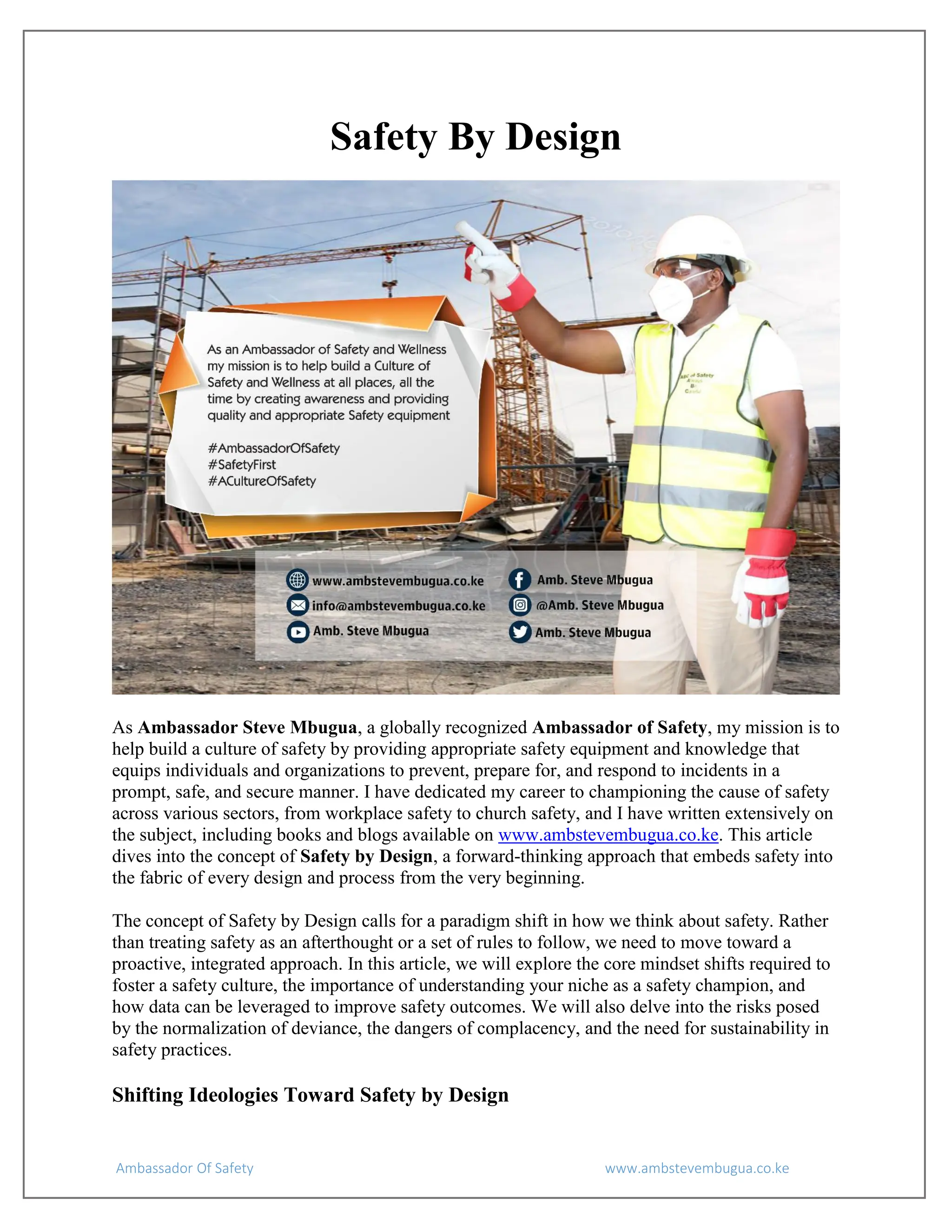 Steve Mbugua, a globally recognized safety ambassador, advocates for the concept of 'safety by design', which integrates safety into every stage of design and operation to proactively prevent incidents. The document emphasizes the importance of understanding niche-specific risks, utilizing data to enhance safety practices, and combating complacency and the normalization of deviance to maintain a robust safety culture. Mbugua encourages organizations to embrace this proactive approach, invest in training, and continuously adapt safety practices for long-term sustainability.