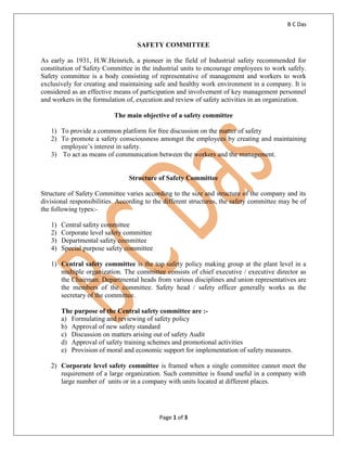 The document discusses safety committees, which were recommended in 1931 to encourage safe work practices. Safety committees are comprised of management and worker representatives tasked with creating and maintaining a safe work environment. Their objectives include providing a discussion platform on safety, promoting safety consciousness, and facilitating communication between workers and management. Committees can be centralized, corporate-level, departmental, or special purpose depending on a company's structure. Effective committees regularly meet with agendas, document meetings, and work to resolve issues, while ineffective ones are disorganized and fail to implement recommendations.