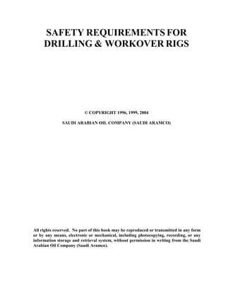 This document outlines safety requirements for drilling and workover rigs operated on behalf of Saudi Aramco. It establishes Saudi Aramco's safety rules for drilling and workover activities, and a uniform set of safety requirements applicable to both contractor and company-owned rigs. The objectives are to minimize risks to personnel and property through application of best petroleum industry loss control programs. Compliance with these requirements and cooperation of all personnel are necessary to fulfill the company's commitment to safety.