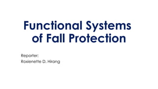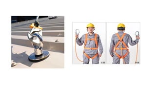 The document categorizes fall protection systems into passive and active types, detailing the four basic categories of active fall protection: fall arrest, positioning, retrieval, and suspension. It emphasizes the requirements set by OSHA, including safety equipment specifications like harnesses, lanyards, and anchor points, which are essential for preventing and responding to falls. It also highlights that a comprehensive fall protection plan must include a post-fall retrieval strategy.