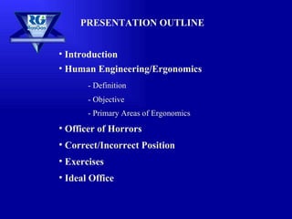 This document provides safety tips and ergonomic guidelines for computer use. It discusses proper positioning of the monitor, keyboard, chair, and other office equipment to reduce strain and injuries. Specific tips are given for correct posture of the head, back, legs, wrists and other body parts. Simple exercises are also outlined to perform at the office to counteract static positioning. The goal is to fit the work environment to the worker for increased safety, comfort and productivity.