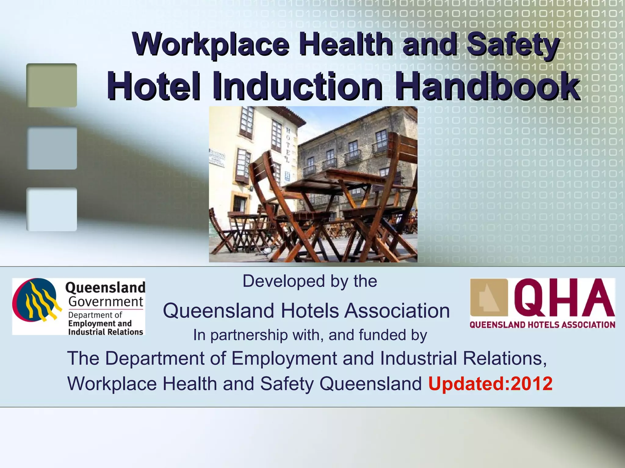 This document provides an overview of workplace health and safety practices for hotel employees. It discusses hazards such as slips, trips and falls, manual handling, working with electricity, kitchen safety, and emergency procedures. The document also outlines employer and employee duties under Queensland health and safety legislation to protect workers and minimize risks. Proper training and following safety procedures are emphasized to create a safe work environment.