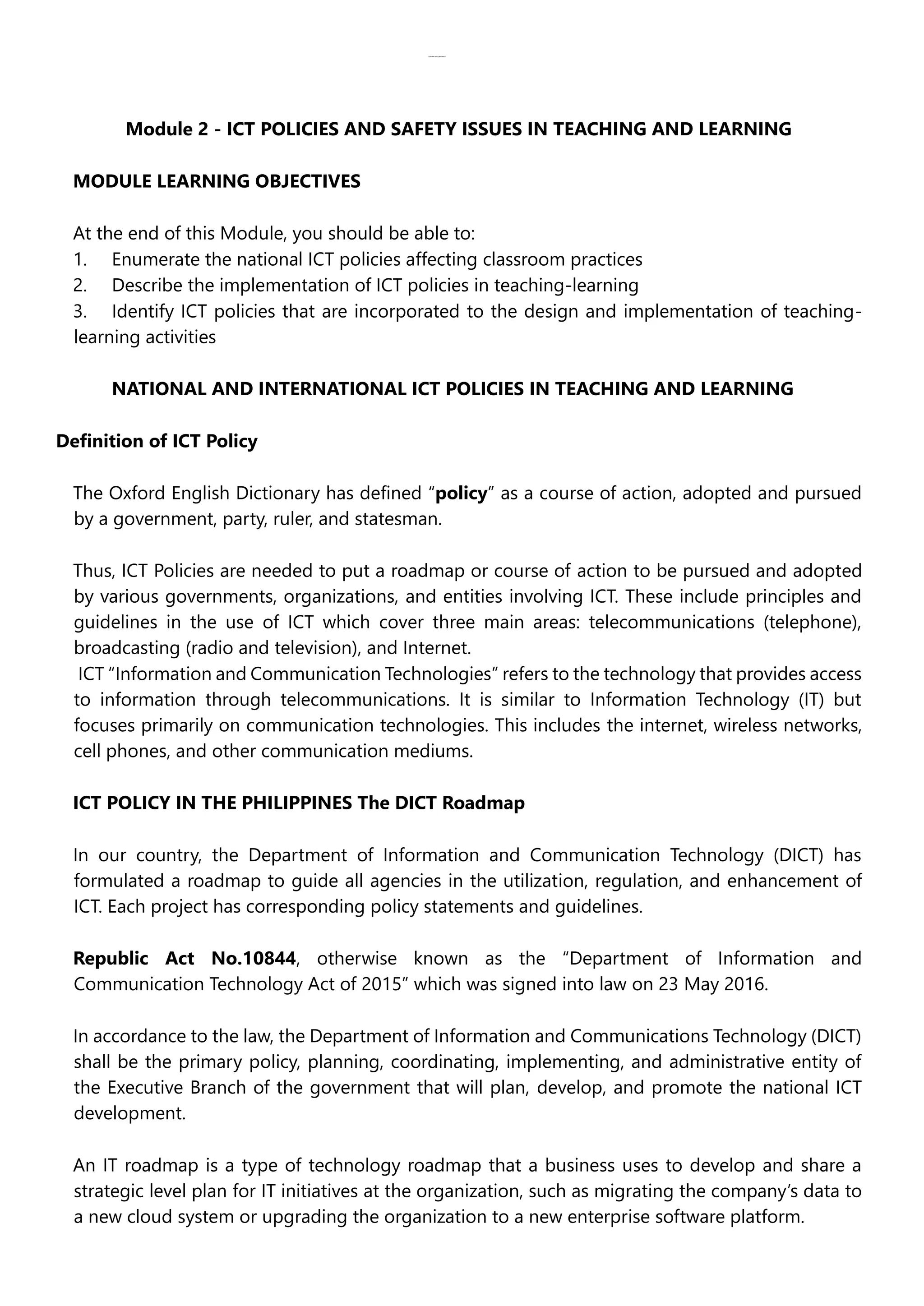This document discusses ICT policies and safety issues related to teaching and learning. It begins by defining ICT policies and noting that they establish guidelines for technology use. It then outlines several national ICT policies in the Philippines, including the DICT roadmap. The document also discusses various safety issues regarding ICT use, such as ergonomic concerns, exposure to inappropriate content, cyberbullying, and privacy risks. It provides recommendations for setting up educational technology rooms and developing network management policies to promote e-safety in schools.
