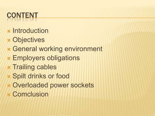 This document discusses safety issues related to information and communication technology (ICT) in the workplace. It provides objectives to inform about common problems in the general working environment and measures to prevent accidents during ICT use. Specific issues covered include ensuring no trailing wires, avoiding overloaded sockets, keeping food and drinks away from equipment, and following employers' obligations to provide a safe workspace. The conclusion emphasizes that proper safety measures are needed to protect both equipment and users.