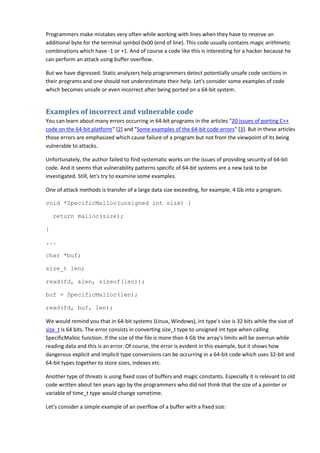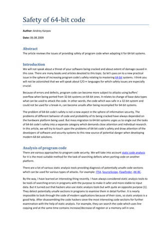 The article discusses the safety concerns associated with adapting program code for 64-bit systems, particularly focusing on C/C++ languages. It highlights how code that is secure on 32-bit systems can become vulnerable due to type conversion errors and logic discrepancies when ported to 64-bit. The article emphasizes the importance of using static analysis tools like PVS-Studio to identify these vulnerabilities and improve coding practices for 64-bit applications.