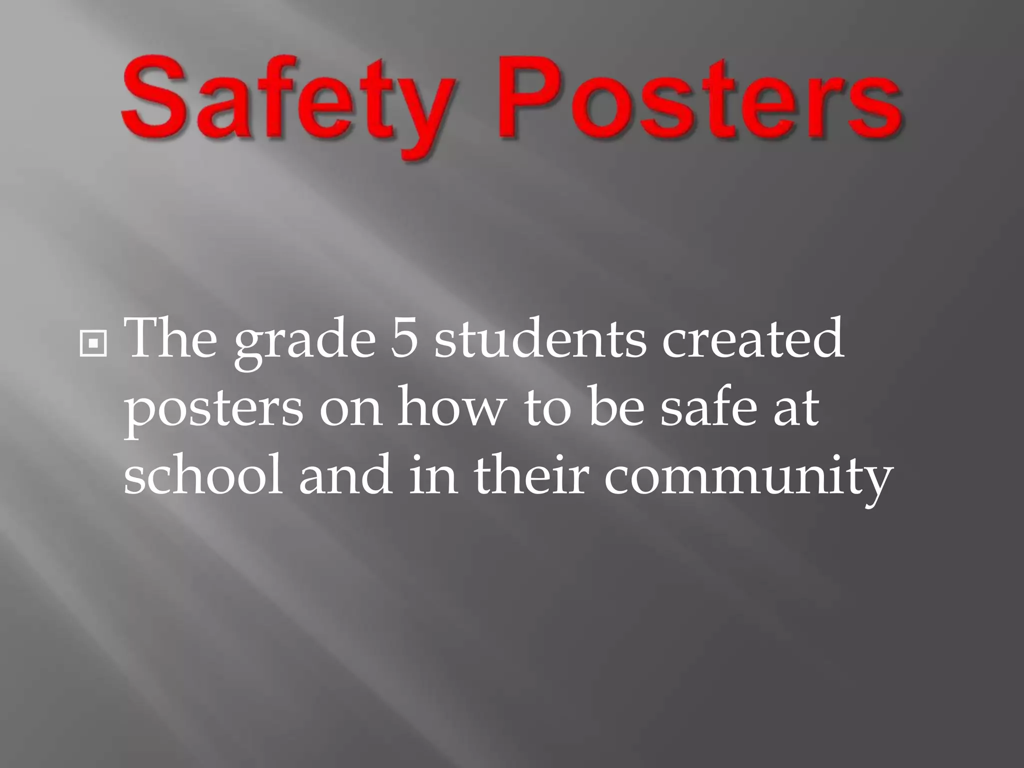 The grade 5 students created posters with safety tips for being safe at school and in their community. The posters likely included advice on topics like stranger danger, bullying prevention, fire safety, and traffic safety. In a concise yet informative way, the posters aimed to help keep students safe both at school and outside of school.