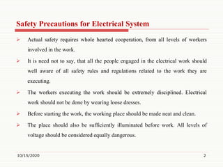 The document outlines safety precautions for electrical work. It states that safety requires cooperation from all workers involved. Workers must be aware of safety rules and regulations and work in a disciplined manner while wearing appropriate clothing. The work area must be neat, clean, and well-illuminated before beginning work. All voltage levels should be considered dangerous, and circuits must be confirmed dead before touching them for any work. Proper permits and safety markings are required, and unauthorized people should be kept away from work areas. Workers should take additional precautions in damp areas and avoid working on live circuits during storms.