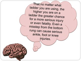 The document discusses safety precautions for using ladders and statistics about ladder-related injuries. It notes that over 300 deaths annually are due to ladder injuries in the US. It recommends choosing the right type of ladder based on its duty rating and intended use. It provides tips for safe ladder setup such as securing it at top and bottom, positioning it at least a quarter of its length from the wall at a 75 degree angle, and staying at least 10 feet from power lines. Additional safety tips include wearing slip-resistant shoes, not standing on the top two rungs, and only using ladders suited for the job.