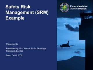 The document presents a practical example of Safety Risk Management (SRM) emphasizing risk assessment and controls in aviation. It outlines the process of hazard identification, risk analysis, and decision-making for managing risks associated with operations at an airport without precision approaches or operational towers at night. The conclusion highlights the need for risk control measures to avoid high-risk situations, particularly during low visibility conditions.