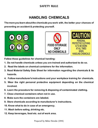 1. The document provides safety guidelines for various workplace hazards and activities, including ladder safety, chemical handling, compressed air safety, electrical safety, fire safety, and more.