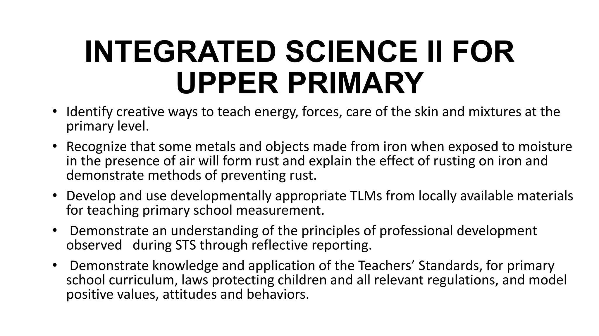 This document outlines the curriculum for an Integrated Science II course for upper primary students. The course covers topics like energy, forces, mixtures, and care of the skin. It aims to teach students to identify creative ways to teach these topics at the primary level and recognize how metals rust. Students will also develop teaching materials from local resources and demonstrate knowledge of teaching standards and child protection laws. The course is divided into 12 units covering these topics over the period of instruction.