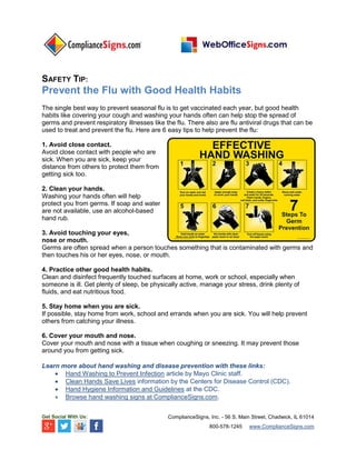 To prevent seasonal flu, getting vaccinated is the best option, but good health habits such as washing hands frequently and covering coughs also help reduce the spread of germs. Additional tips include avoiding close contact with sick individuals, practicing good hygiene, staying home when ill, and maintaining a healthy lifestyle. Antiviral drugs are available for flu treatment and prevention.