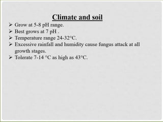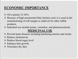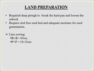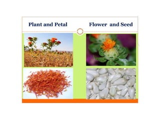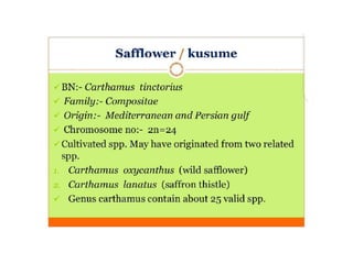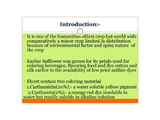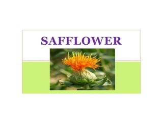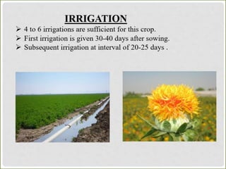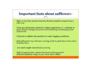 The student Usama Majeed submitted a project on safflower production technology to Dr. Muhammad Asghar Shah for their 6th semester. The document outlines that safflower is planted at a seed rate of 8-10 kg per hectare and the seeds should be treated with Penlate and Vitavax pesticides to resist diseases, and the optimal temperature for growth is 24-32 degrees Celsius.