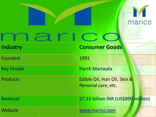 Marico Limited, founded in 1991, is a leading Indian consumer goods company specializing in health and beauty products, with a focus on edible oils and personal care items, generating revenues of INR 57.33 billion (USD 890 million). The company offers a range of health-focused products under its Saffola brand, including cooking oils and food items designed to promote heart health, while targeting primarily urban consumers who are health-conscious. Their marketing emphasizes the unique health benefits of their products through innovative technologies and lifestyle integration.