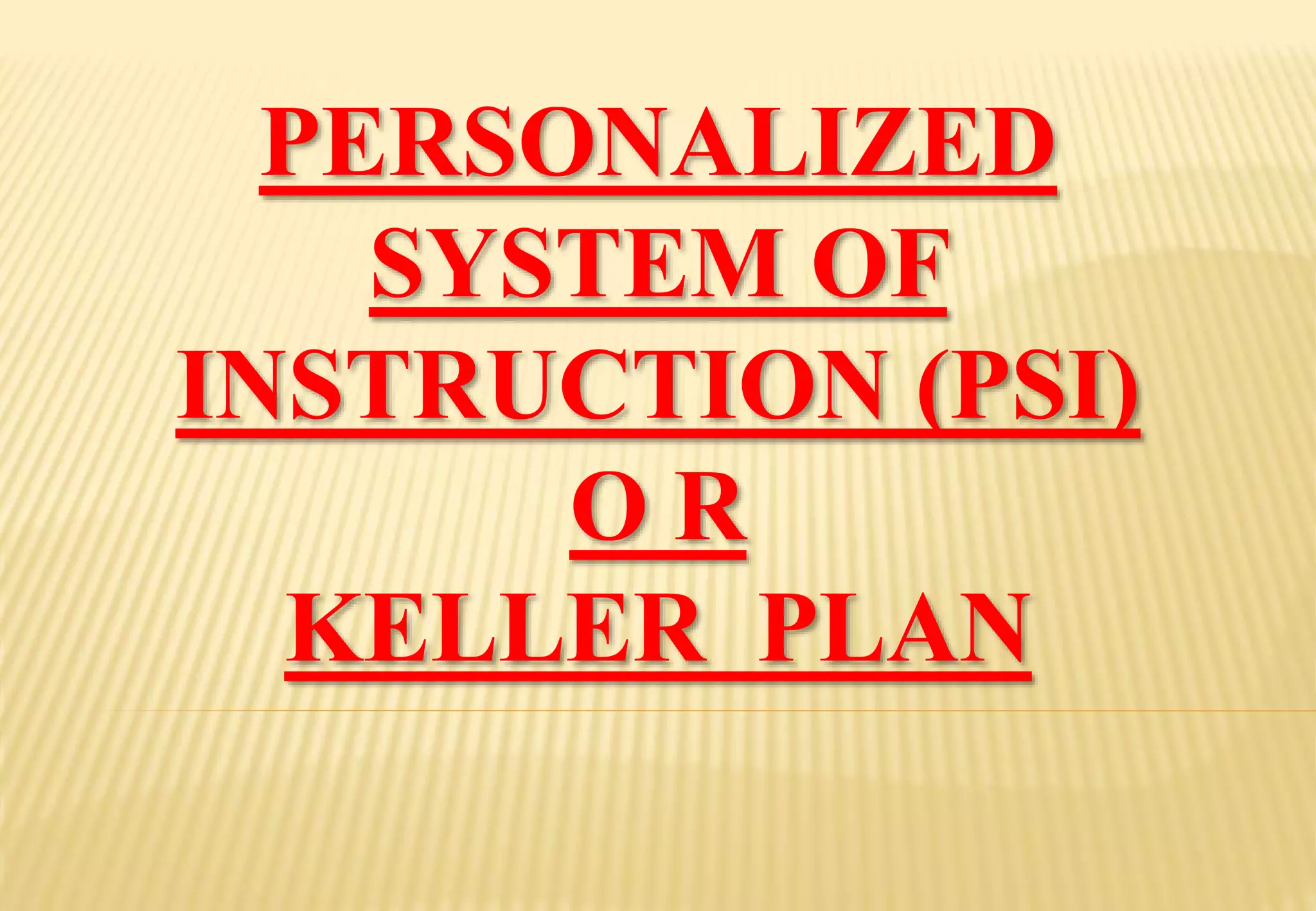 The document discusses the Personalized System of Instruction (PSI), also known as the Keller Plan. It was originated by Fred Keller in 1965 as an individualized instruction model for college-level education. PSI is composed of small, self-paced modules where students progress through study guides. It has advantages like allowing students to learn at their own pace and developing cooperation. However, teachers may lack enthusiasm to implement new ideas.