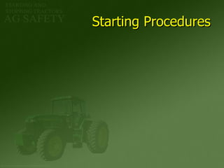 The document provides guidance on safely starting and stopping tractors. It outlines starting procedures which include performing daily maintenance checks, mounting the tractor safely, adjusting seats and controls, checking for others in the area, depressing the clutch, opening the throttle, turning switches on, and checking indicator lights before turning the key to start. It describes different engine types like gasoline, diesel, and LPG and important considerations for each like warming up diesel engines. The document stresses the importance of proper warm-up procedures and following operator's manuals for starting, stopping and troubleshooting issues. Stopping instructions vary by engine type but should be done correctly to avoid problems.
