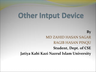 This document discusses and classifies other input devices. It describes pens, touch screens, and game controllers as devices for the hand. It also discusses touch screens, bar code readers, image scanners, optical character recognition, and microphones as audiovisual input devices. Pens allow for handwriting input on devices like PDAs and tablets. Touch screens use sensors to allow finger input on screens. Game controllers include joysticks and game pads for computer game input. Bar code readers identify bar codes to input product information into computers. Image scanners and OCR convert images and characters into electronic formats. Microphones input audio, such as for video conferencing.