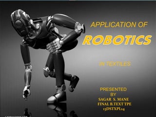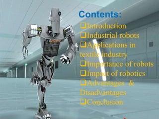 The document discusses the application of robotics in the textile industry, highlighting various types of robots and their specific uses such as in spinning, garment manufacturing, and fabric testing. It emphasizes the benefits of automation, including increased productivity, improved product quality, and cost reduction, while also addressing the disadvantages such as high costs and potential job displacement. The conclusion suggests further development and integration of robotics in textiles will depend on economic factors within the sector.
