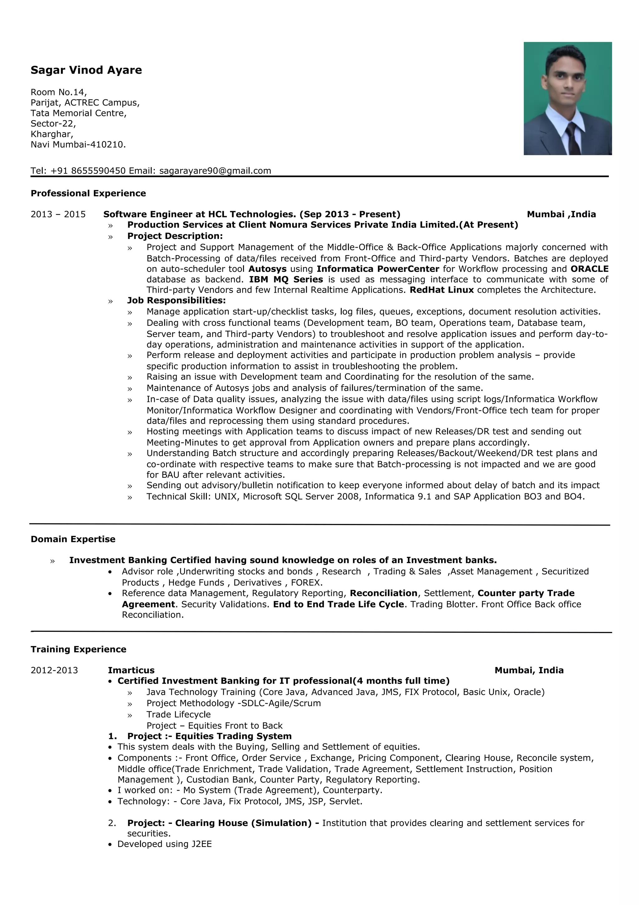 Sagar Vinod Ayare is a software engineer with experience in production services and batch processing at HCL Technologies. He has worked on projects involving middleware like Informatica and messaging platforms like IBM MQ Series. His responsibilities included managing application start-up tasks, troubleshooting issues, and coordinating releases. Ayare has expertise in investment banking domains and completed certification and internship programs focused on the equities trading lifecycle. He holds a BE in Computer Science and has experience developing applications for healthcare domains.