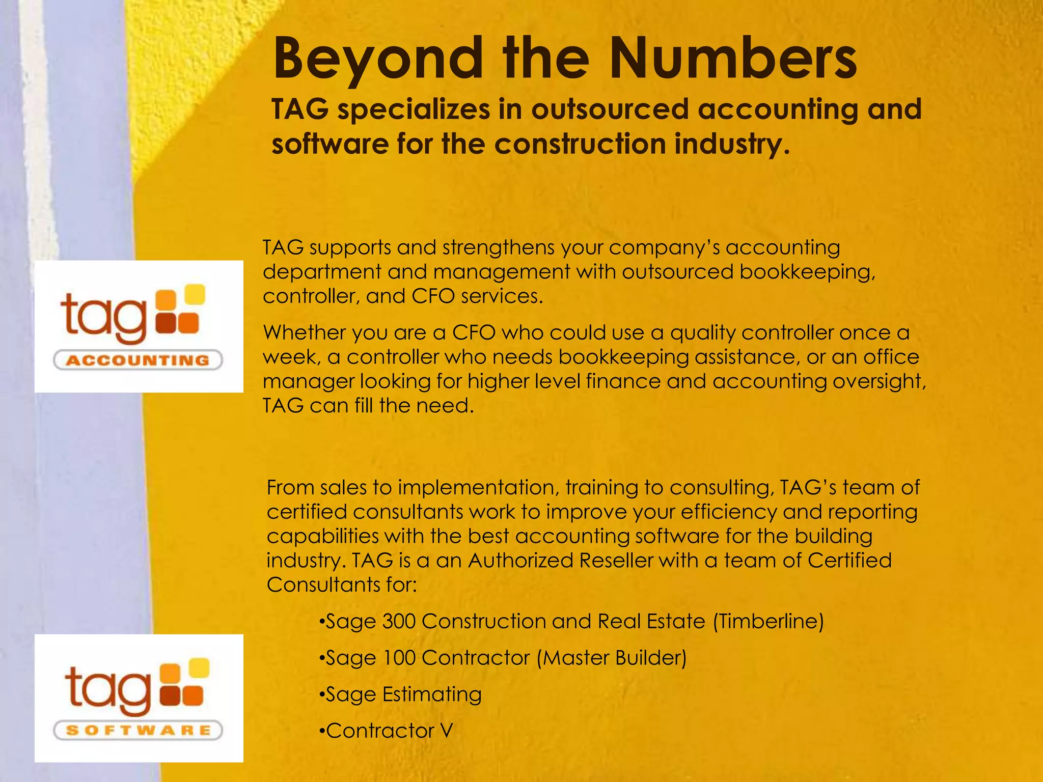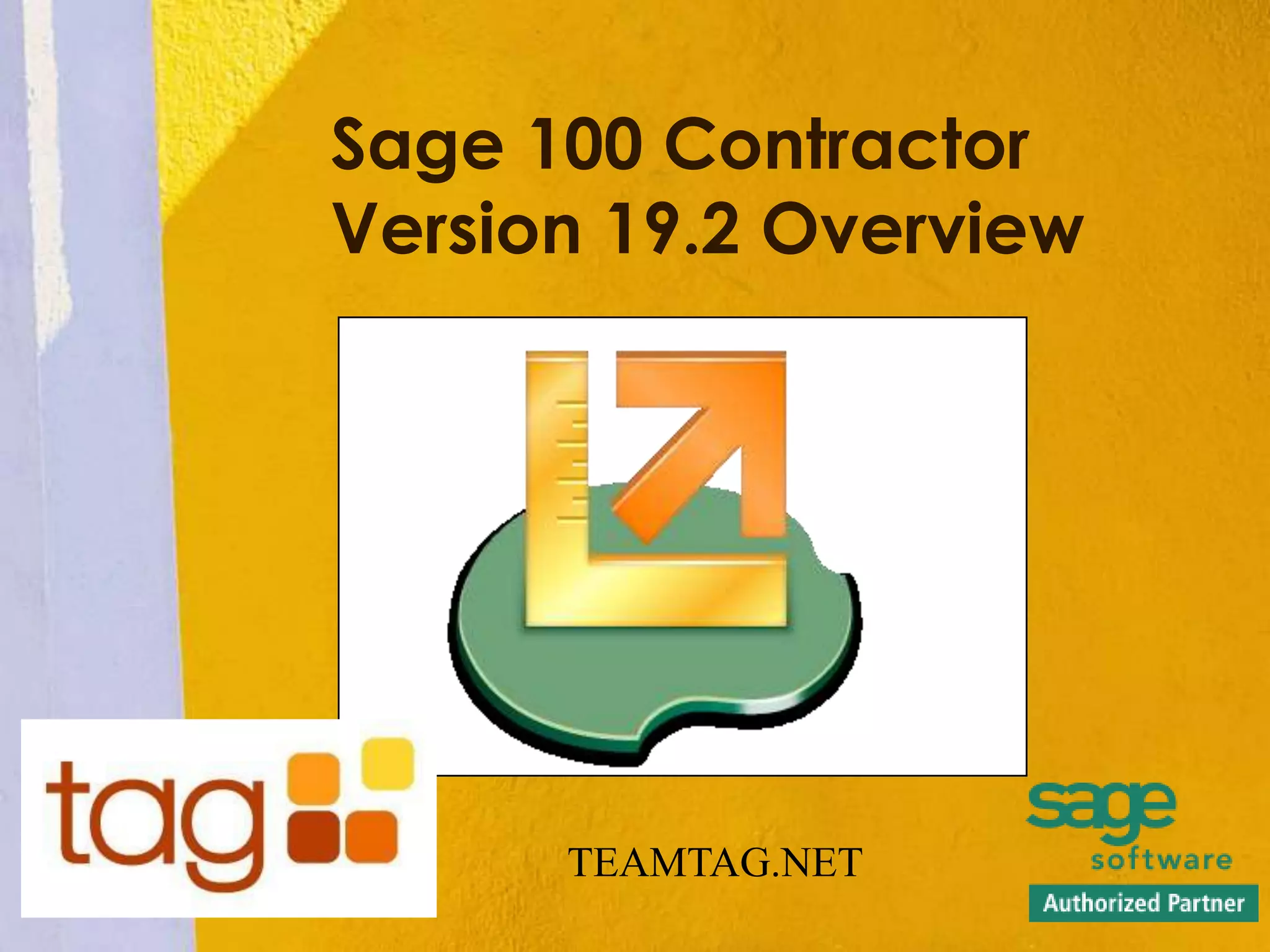 The document provides an overview of Sage 100 Contractor version 19.2, detailing its features and services for the construction industry, including improved year-end processes and state-certified reporting for ten states. It emphasizes the role of TAG in offering outsourced accounting services and premium consulting to enhance efficiency and reporting. Additionally, it highlights the integration of Sage Construction Anywhere for improved project management and communication between office and field teams.