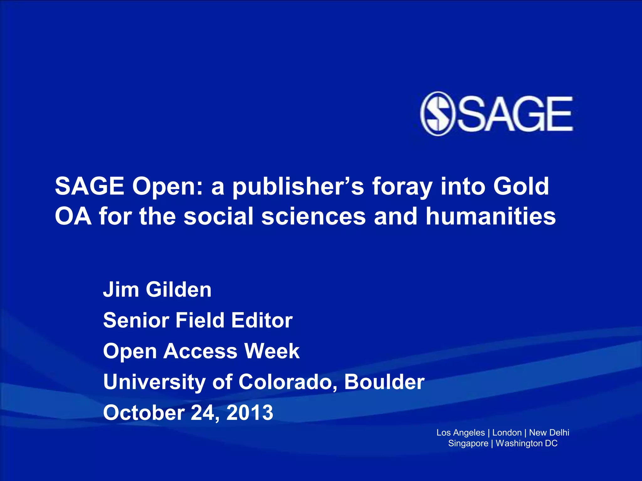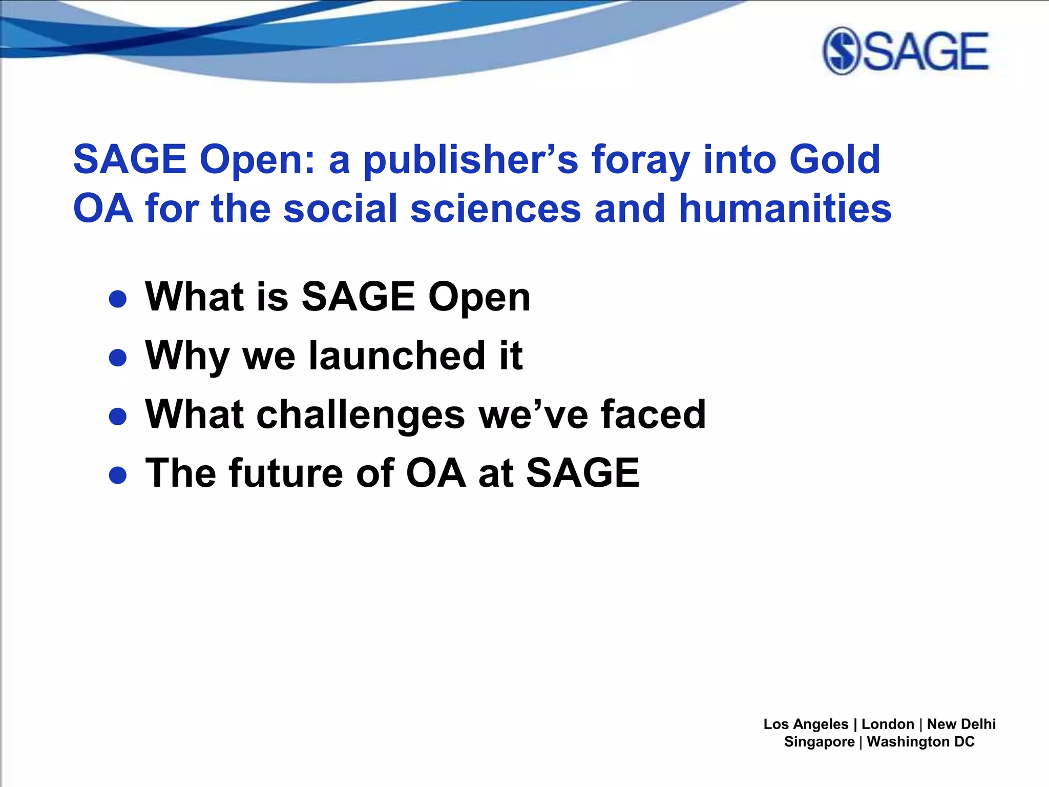 SAGE Open is an open access journal launched by SAGE Publications in 2011 to serve the social sciences and humanities. It uses the PLOS One model of peer review. Since its launch, it has received over 2,500 submissions from 62 countries. While challenges include marketing open access to the humanities and social sciences, addressing perceptions of open access publishing, and pricing, SAGE plans to launch 40 additional open access journals in 2014 to further their involvement in open access scholarly communication.