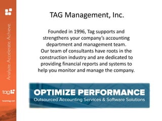 This document provides tips for a successful implementation of construction software. It introduces TAG Management, Inc. and their team of consultants who have experience in the construction industry. Their lead consultant, Nicole Romero, has over 10 years of experience providing accounting services for contractors using Sage 100 Contractor. The document outlines factors to consider for readiness, such as project urgency, availability, and payroll processing. It emphasizes the importance of due diligence, using a certified consultant, having realistic expectations, commitment, preparing teams, and developing a budget to ensure a successful implementation.