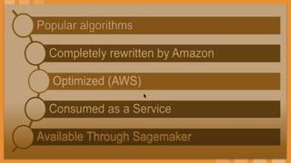 This document provides an overview of Amazon SageMaker's built-in algorithms for machine learning including supervised, unsupervised, and self-supervised algorithms. It describes algorithms for problems like classification, regression, forecasting, anomaly detection, clustering, dimensionality reduction, text analysis, and computer vision. Example use cases are provided for each type of algorithm and data input format.