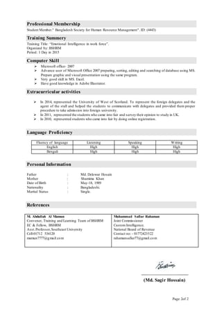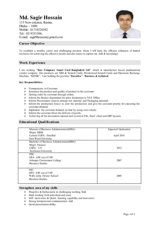 This document is a resume for Md. Sagir Hossain. It summarizes his career objective, work experience, educational background, skills, and references. He currently works as an Executive for East Compeace Smart Card Bangladesh Ltd, where he is responsible for communicating with customers, introducing products, taking orders, and ensuring timely delivery. He has a Bachelor's degree in Business Administration from Southeast University and is currently pursuing an MBA from East West University, expected to graduate in April 2016. His skills include Microsoft Office, Adobe Illustrator, communication, and presentation abilities.