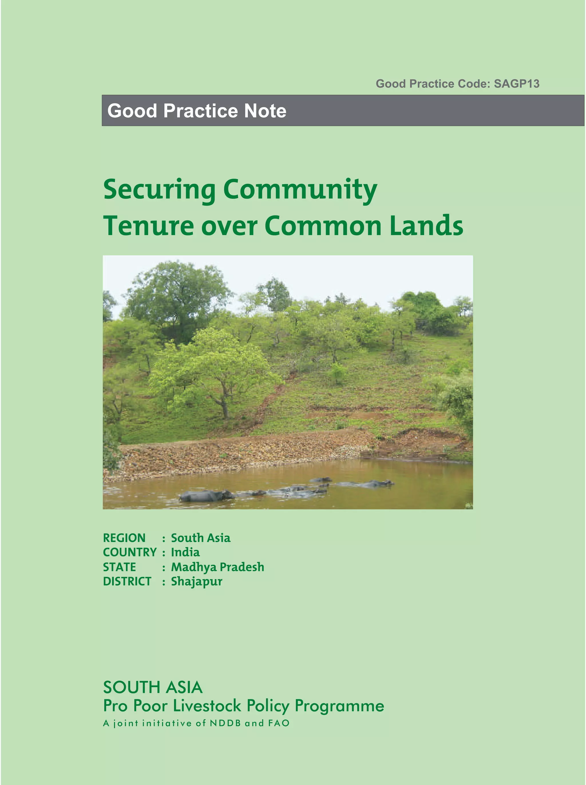 The document outlines a good practice note aimed at securing community tenure over common lands in Madhya Pradesh, India, as part of the South Asia Pro Poor Livestock Policy Programme. It discusses the importance of community governance for the sustainable management of common resources, highlighting the participation of various local stakeholders including marginalized populations, and details the socio-economic impacts, such as improved fodder availability and increased water access for livestock. The initiative emphasizes collective action, social capital building, and the establishment of self-governing rules for effective management of commons.