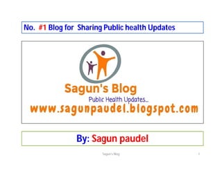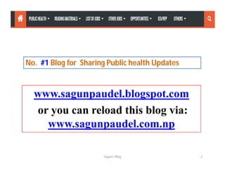This document describes Sagun Paudel's public health blog. The blog contains 14 sections that provide information on public health topics, jobs, opportunities, and how to navigate the blog. Sections include posts on public health courses and news, important days, activities, documents for exams, job listings for various health roles, scholarships, and how to search and join the blog community. The goal is to be the No. 1 blog for sharing public health updates and information in Nepal.