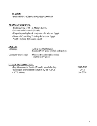 Sahar Essam Abd El Monam is seeking a job as an accountant. She received her BSc in Commerce with a major in Accounting from Ain Shams University in 2013. She has over 2 years of experience working as a Junior Accountant for Life Petrochem Tank Terminal and over 2 years of experience as an External Auditor for MAZARS Mostafa Shawki & Co. Auditors & Chartered accountants where she audited several companies. She is proficient in English, Arabic, Microsoft Windows, and has taken several accounting and audit training courses.