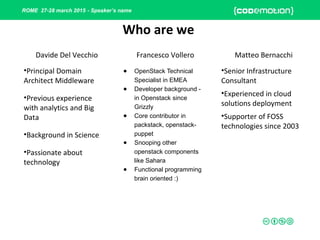 The document discusses a presentation on OpenStack Sahara given at a conference in Rome. It begins with introducing the three speakers and their backgrounds. It then provides an agenda for the presentation which includes an introduction to big data, an overview of OpenStack components, and a demonstration of Sahara in action. The presentation discusses what big data is, provides a brief history of MapReduce and Hadoop, and explains how OpenStack is well-suited to host big data platforms through its various components and architecture. It concludes by introducing OpenStack Sahara as a way to simplify deploying and managing Hadoop clusters on OpenStack.