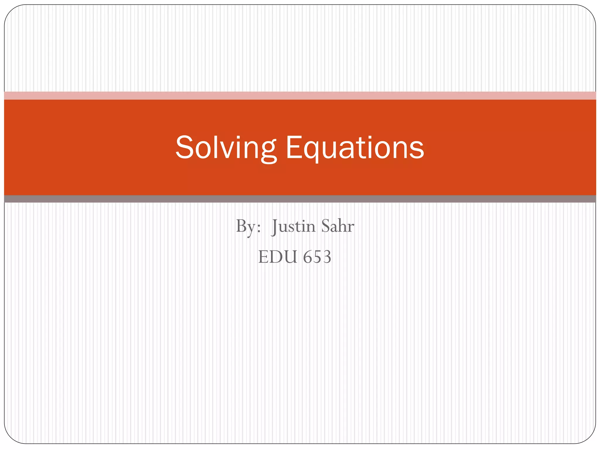This document provides instruction on solving one-step and two-step equations. It begins with the relevant common core standard and learning objectives. Useful vocabulary is defined, including equation, variable, inverse operations, and solution. The steps for solving one-step equations are outlined as looking at the operation on the variable, doing the inverse operation to both sides, and isolating the variable. Examples are worked through. Two-step equations are similarly explained as requiring simplification before inverse operations. More examples are given along with story problems to practice application. References are provided for images and vocabulary.