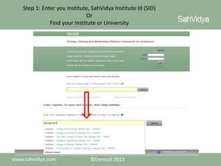 The Sahvidya registration process is a 10 step process where users enter their institute ID or find their institute or university. If the institute or university is found, the user selects it and proceeds directly to registration. If not found, the user adds their university and institute in steps 3 and 4 before selecting it in step 5. In steps 6 through 9, the user selects their department, program/degree, and stream/concentration, adding any missing options. On the final step, the user adds other details and completes registration.