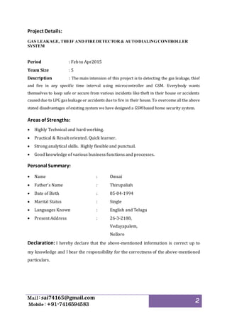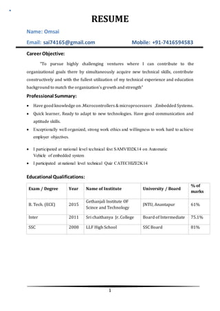 The document is a resume for an individual named Omsai, focusing on their career objective, professional and educational qualifications, and project experience. Omsai has expertise in microcontrollers, embedded systems, and has participated in national technical events. The resume also highlights personal details, strengths, and a declaration of the information's accuracy.
